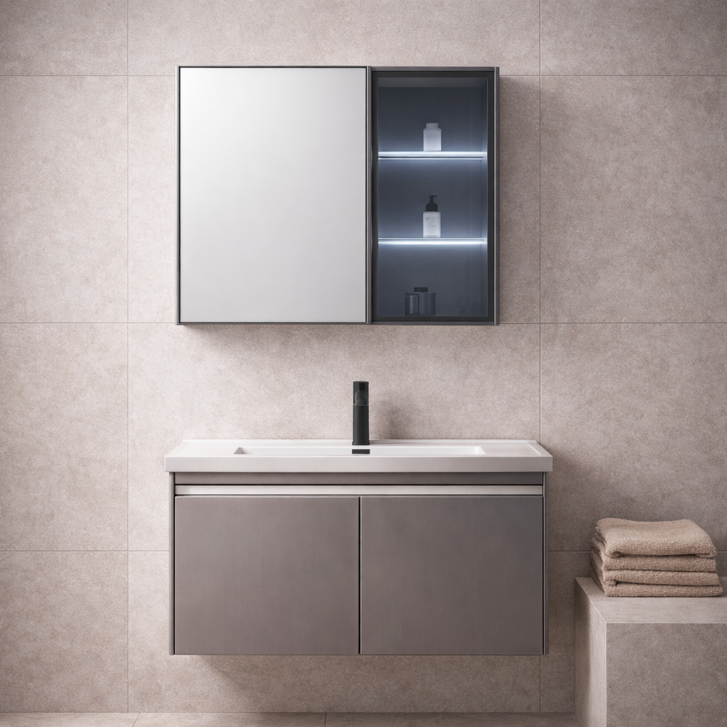 Incluye un gabinete mural con puerta de espejo y compartimentos internos iluminados, ideal para organizar productos de uso diario con un toque sofisticado.