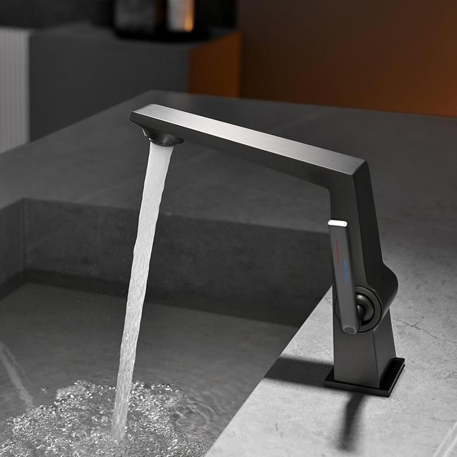 Esta mezcladora destaca por sus líneas angulares bien definidas y una silueta arquitectónica que aporta carácter al lavamanos. Su diseño monomando permite un manejo cómodo y preciso del flujo y la temperatura del agua.
